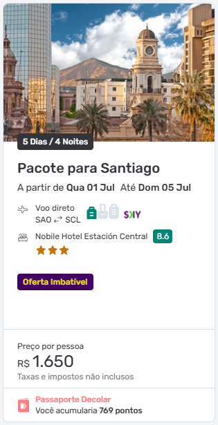 Entre os pacotes julho 2026 internacionais, encontramos opção para Santiago, no Chile, período em que a cidade costuma receber turistas interessados na temporada de neve.