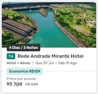 A Decolar está com pacotes para Foz do Iguaçu a partir de R$ 709 por pessoa + taxas, com voos + hotel inclusos. O menor valor aparece saindo de São Paulo, mas há ótimas opções também saindo de outras cidades.
