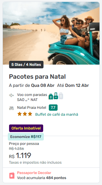 O Esquenta Black Friday da Decolar trouxe nesta quarta-feira (26) uma ótima oportunidade para quem quer viajar para o Nordeste: pacote para Natal com passagens aéreas + hotel com café da manhã a partir de R$ 1.305 por pessoa, valor confirmado após a simulação completa até a tela final de pagamento.