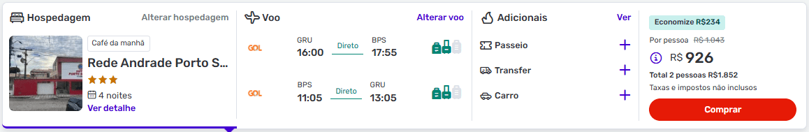A promoção inclui voos diretos para Porto Seguro com hospedagem em ótimas opções te hotéis como o Rede Andrade Porto Seguro, localizado a 10 minutos de carro de Complexo de Lazer Tôa Tôa and Axé Moi Complexo de Lazer, por preços a partir de R$ 926 por pessoa (4 noites).