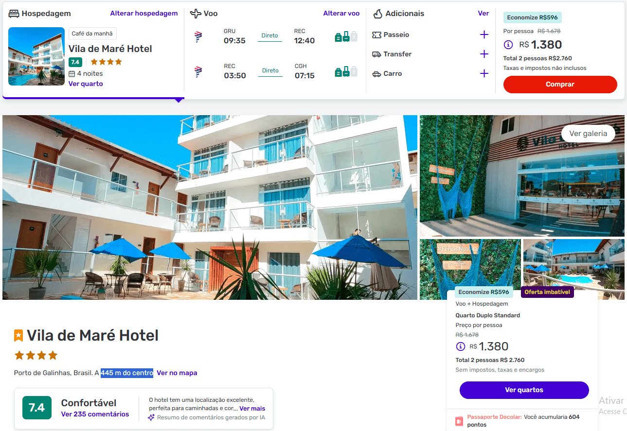 Há oportunidades de viajar barato pagando a partir de R$ 1.380 por pessoa para ficar 4 noites em hotéis charmosos, como o Vila de Maré Hotel, em Porto de Galinhas, a 445 metros do centro da cidade.