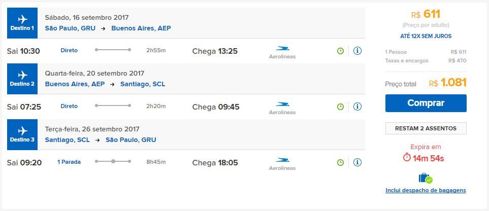 São Paulo Buenos Aires (16/set) – Buenos Aires Santiago (20/set) – Santiago São Paulo (26/set): R$1.081, taxas inclusas.