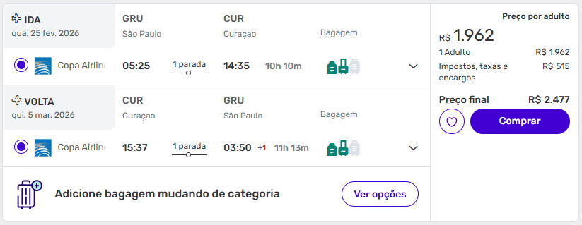Encontramos muitas promoções de passagens para Curaçao, com preços muito baixos e várias datas disponíveis para embarque.