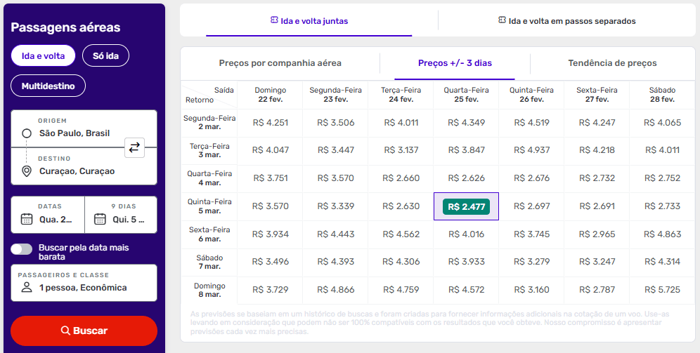Faça sua busca e clique em “Preços +/- 3 dias” que um calendário com combinações de datas com as melhores ofertas irá se abrir.