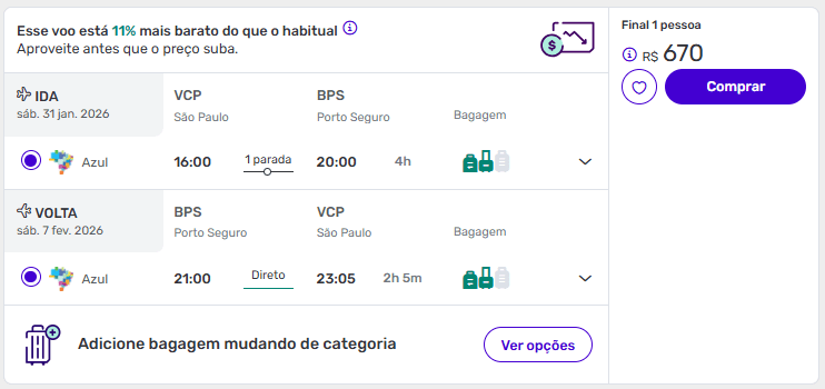 Algumas das ofertas mais em conta partem do Rio de Janeiro, Vitória, Curitiba ou Campinas, com destino a Salvador ou Porto Seguro, e datas disponíveis para quem quer viajar no primeiro trimestre de 2026.