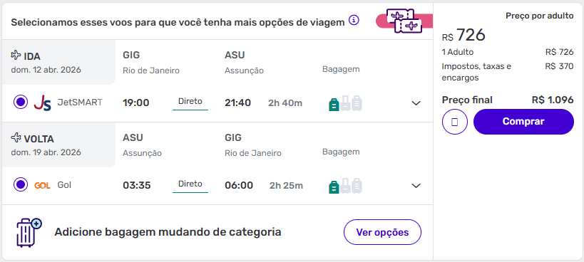 Ida em 12 de abril de 2026 e volta em 19 de abril de 2026.