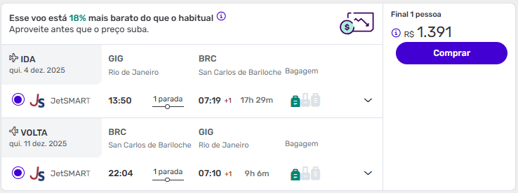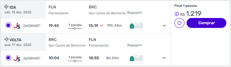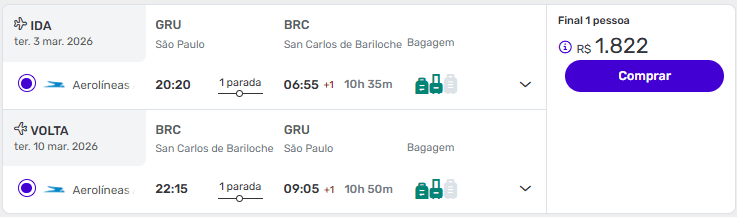 Encontramos nesta segunda-feira (3), ofertas de voos de ida e volta para Bariloche a partir de R$ 1.219, com taxas inclusas, no site da Decolar.