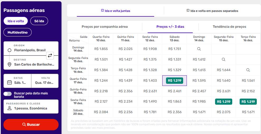 Faça sua busca e clique em “Preços +/- 3 dias” que um calendário com combinações de datas com as melhores ofertas irá se abrir.