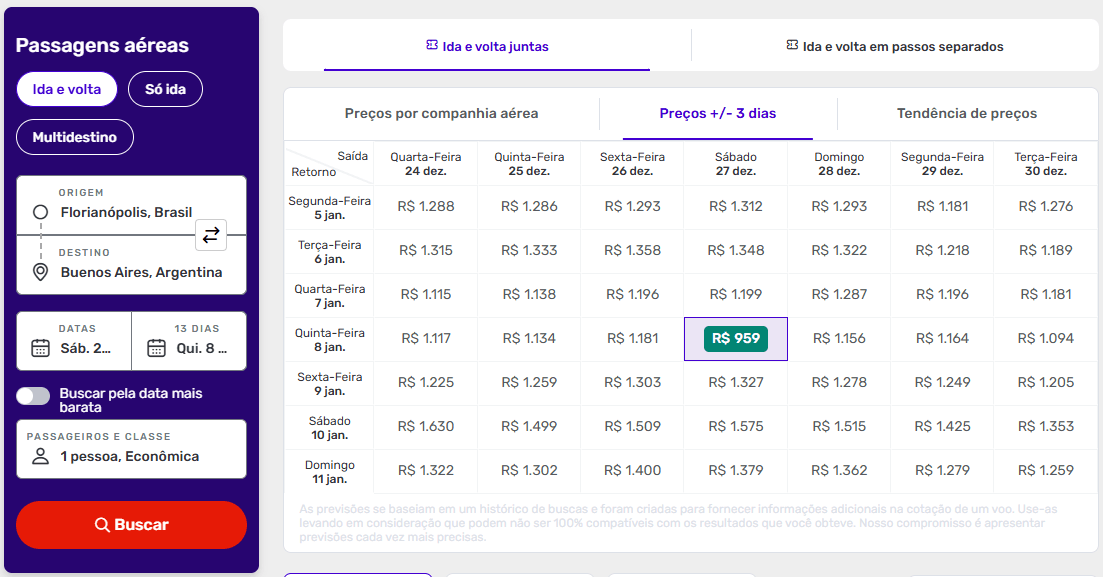 Faça sua busca e clique em “Preços +/- 3 dias” que um calendário com combinações de datas com as melhores ofertas irá se abrir.