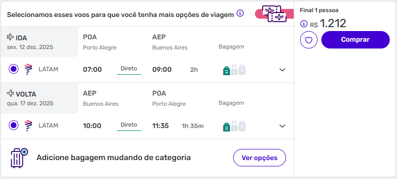 De Porto Alegre para Buenos Aires a partir de R$ 1.212 ida e volta.