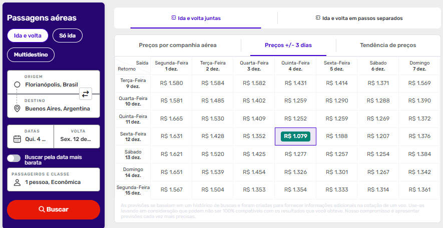 Faça sua busca e clique em “Preços +/- 3 dias” que um calendário com combinações de datas com as melhores ofertas irá se abrir.