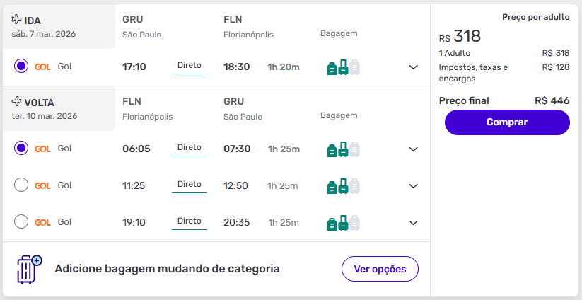 Neste momento, março, abril e maio são os meses que estão com as melhores ofertas para embarcar para Floripa.