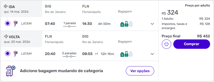Passagens de Rio de Janeiro para Florianópolis a partir de R$ 452 ida e volta.