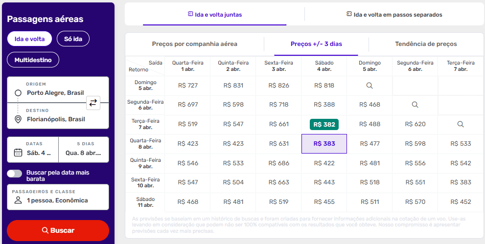 Faça sua busca e clique em “Preços +/- 3 dias” que um calendário com combinações de datas com as melhores ofertas irá se abrir.