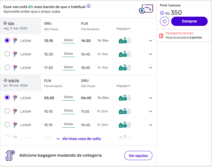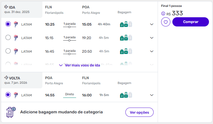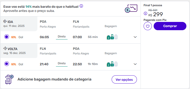 Encontramos, neste sábado (25), voos de ida e volta muito baratos para Florianópolis ou Porto Alegre a partir de R$ 299, já com taxas inclusas, no site da Decolar.