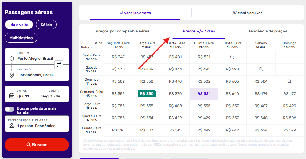 Faça sua busca e clique em “Preços +/- 3 dias” que um calendário com combinações de datas com as melhores ofertas irá se abrir.