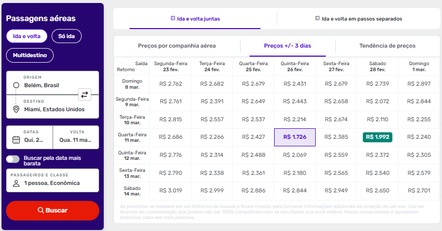 Faça sua busca e clique em “Preços +/- 3 dias” que um calendário com combinações de datas com as melhores ofertas irá se abrir.