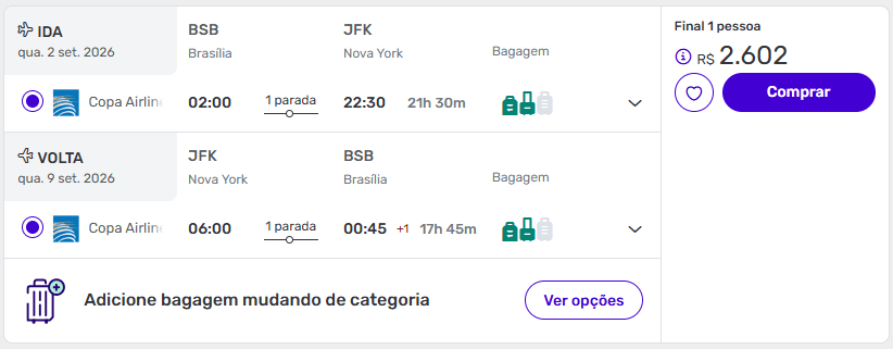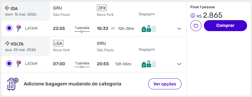Com as ofertas imperdíveis que encontramos nesta segunda (8/12), é possível garantir passagens aéreas de ida e volta para a cidade que nunca dorme a partir de R$ 2.602, já com taxas inclusas.