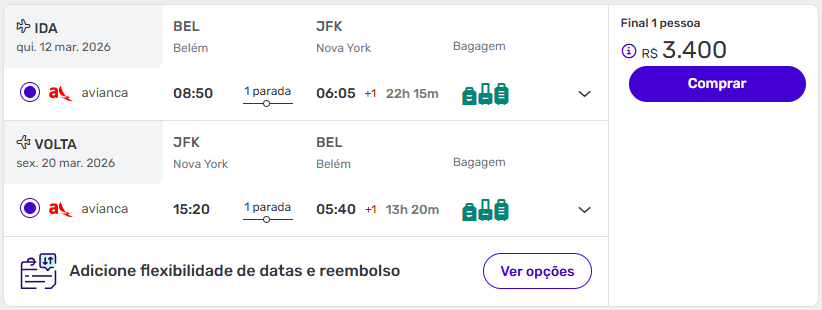 Passagens de Belém para Nova York a partir de R$ 3.400 ida e volta.