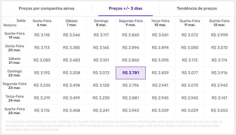 Faça sua busca e clique em “Preços +/- 3 dias” que um calendário com combinações de datas com as melhores ofertas irá se abrir.