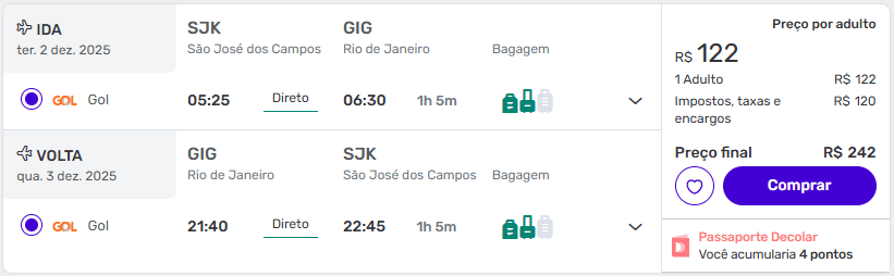 São passagens aéreas de ida e volta a partir de R$ 242 com taxas inclusas, na Decolar.