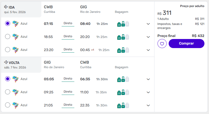 Passagens de Curitiba para o Rio de Janeiro a partir de R$ 432 ida e volta.
