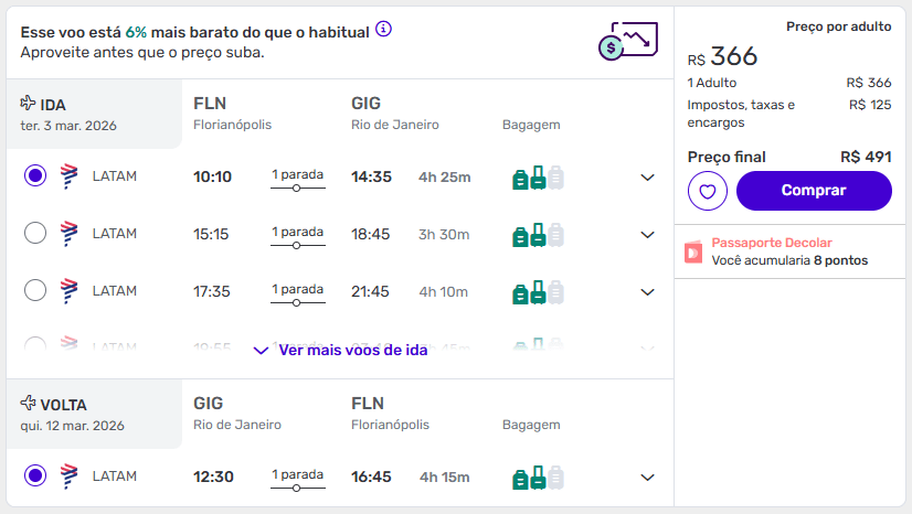 Passagens de Florianópolis para o Rio de Janeiro a partir de R$ 491 ida e volta.