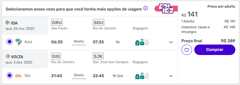 Passagens de São Paulo para o Rio de Janeiro a partir de R$ 289 ida e volta.