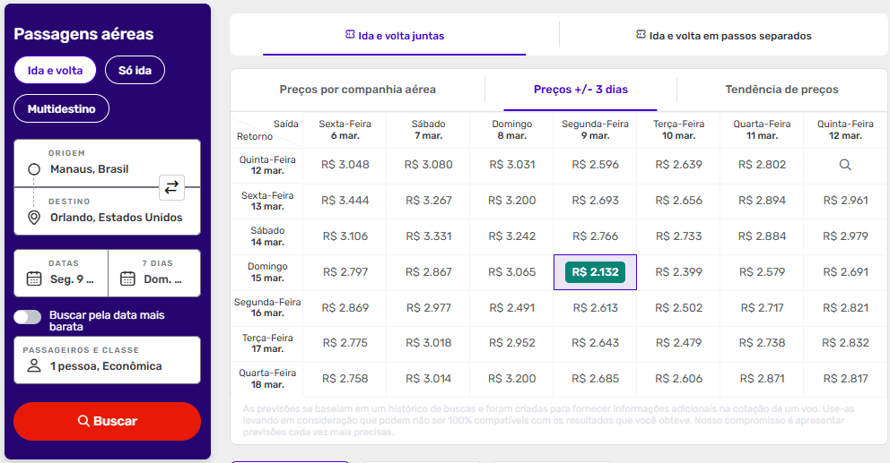 Faça sua busca e clique em “Preços +/- 3 dias” que um calendário com combinações de datas com as melhores ofertas irá se abrir.