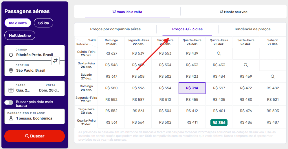 Faça sua busca e clique em “Preços +/- 3 dias” que um calendário com combinações de datas com as melhores ofertas irá se abrir.