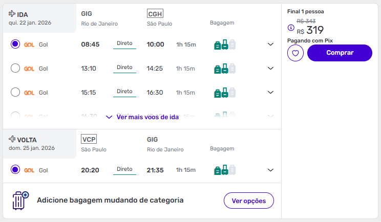 Do Rio de Janeiro para São Paulo a partir de R$ 319 ida e volta
