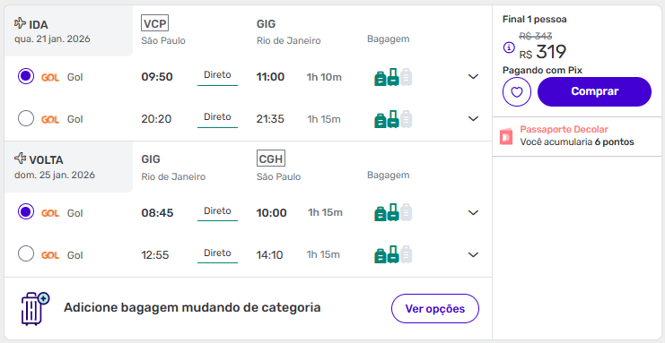 Encontramos, neste sábado (25), voos de ida e volta muito baratos para São Paulo ou Rio de Janeiro a partir de R$ 292, já com taxas inclusas, no site da Decolar.
