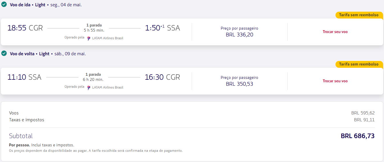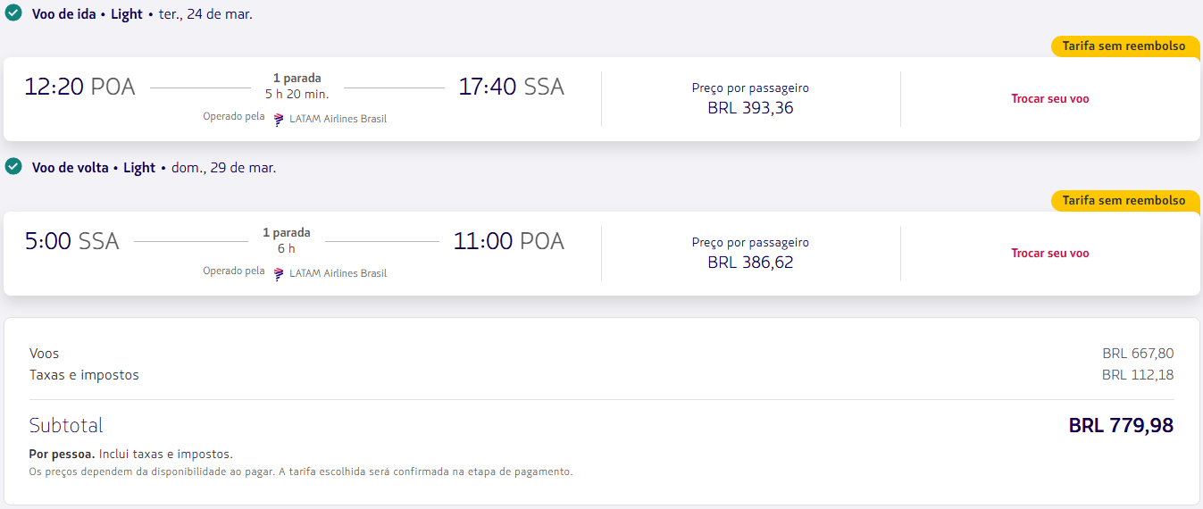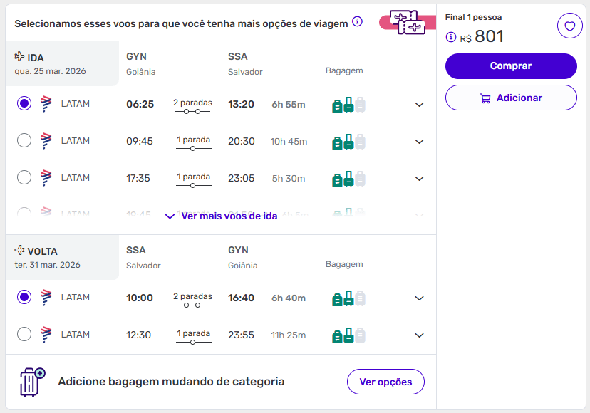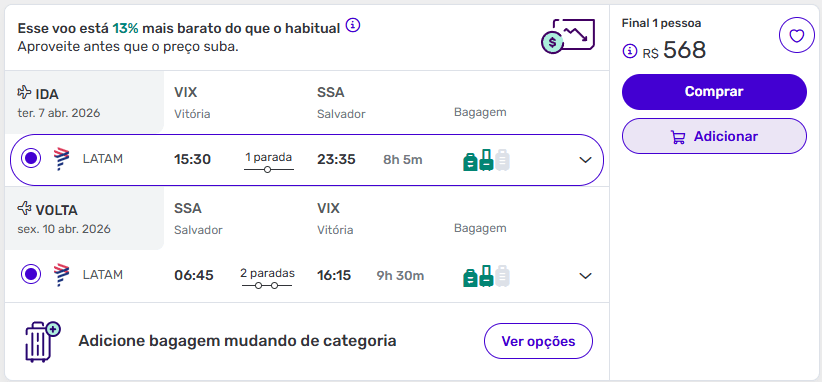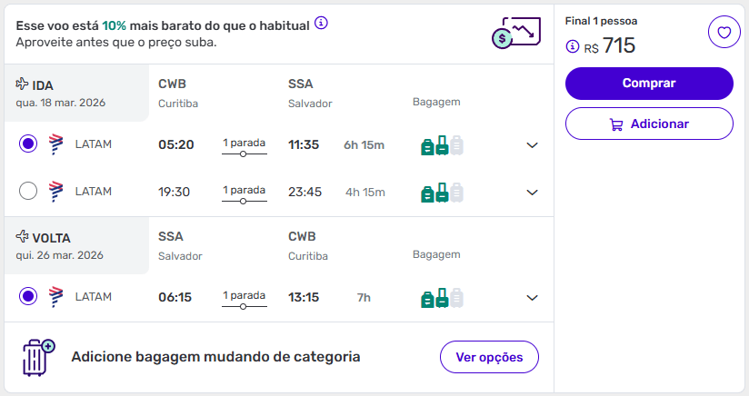 - Vale verificar tanto Salvador quanto Porto Seguro, já que os preços nem sempre se comportam da mesma forma para os dois destinos.