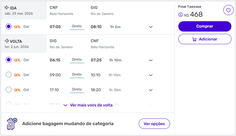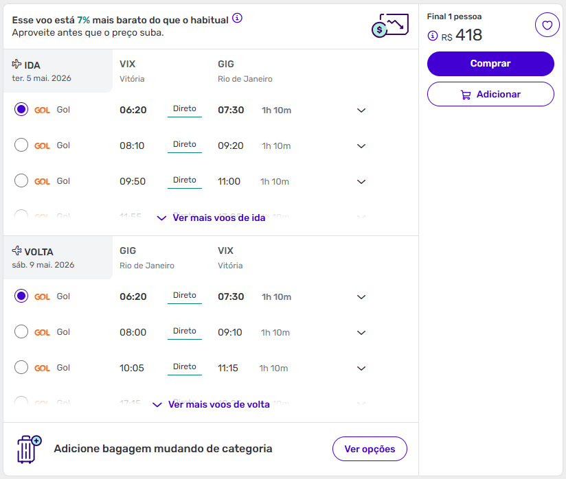 O grande destaque aqui é a combinação de preço baixo com alta frequência de voos, o que permite escolher horários mais convenientes.