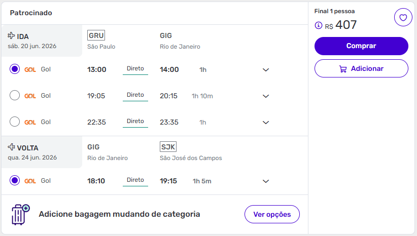 São Paulo para Rio de Janeiro a partir de R$ 407