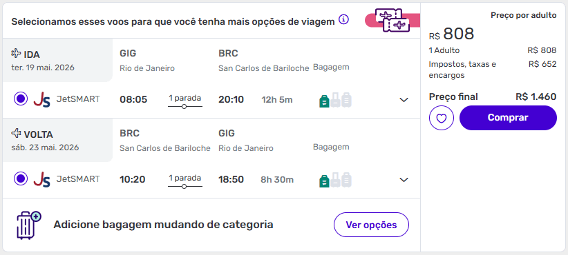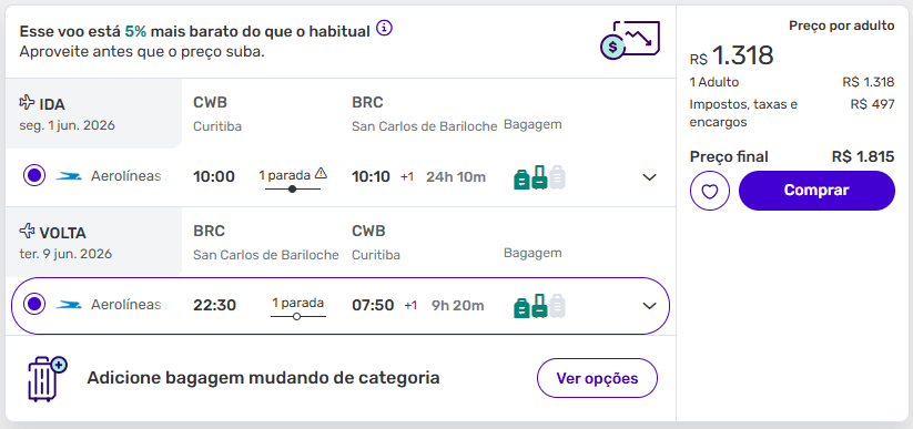 Essa funcionalidade é especialmente útil em destinos sazonais, como Bariloche, onde pequenas mudanças de data podem alterar significativamente o valor final da passagem.
