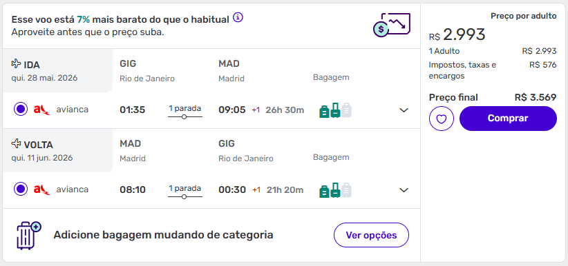 Rio de Janeiro → Madrid entre maio e junho de 2026