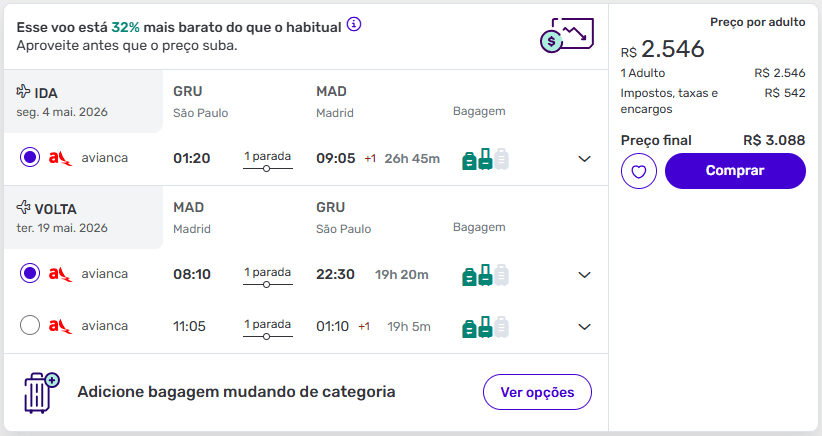 Saindo de São Paulo (GRU), há registros de tarifas abaixo da média histórica para maio de 2026, com operação da Avianca e conexão internacional.