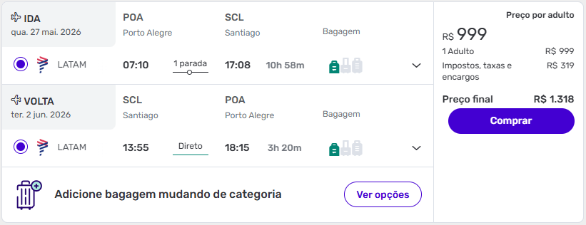 Mesmo com conexão na ida, pode ser interessante para quem busca datas específicas no fim de maio, período em que Santiago começa a registrar temperaturas mais baixas e possibilidade de neve nas montanhas.