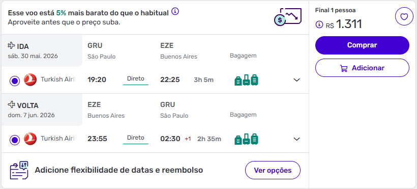 Buenos Aires costuma ter alta procura, principalmente por ser um destino próximo e com ótimo custo-benefício. Quando surgem tarifas com até 5% de desconto, a tendência é de aumento rápido.