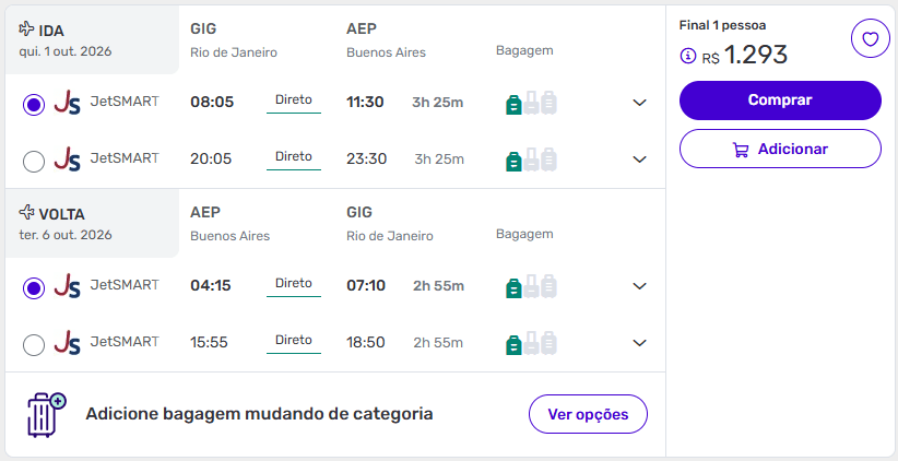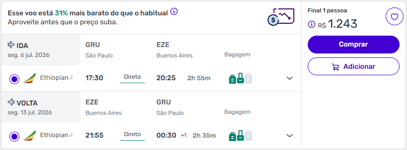 Passagens internacionais para Buenos Aires raramente ficam abaixo desse patamar com voos diretos. Quando aparecem: