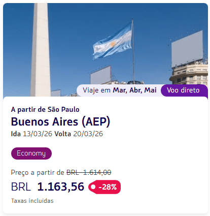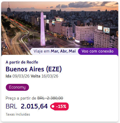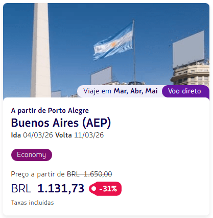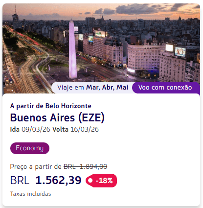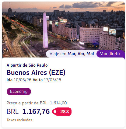 Os valores estão disponíveis para viagens em classe econômica entre fevereiro e setembro de 2026, variando conforme a cidade de origem e a data escolhida.