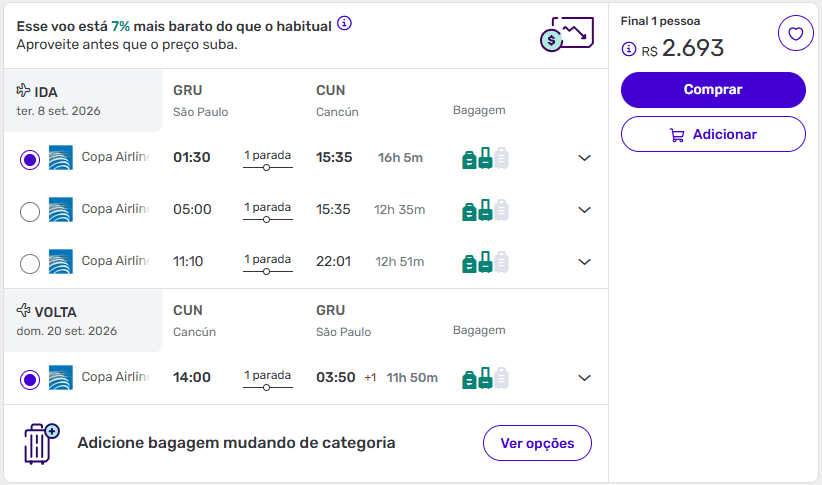 - Volta: 20 de setembro, com 1 parada (11h 50m)