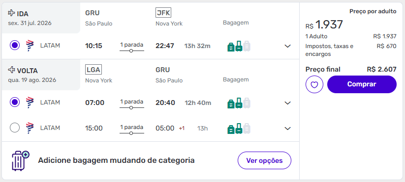 A tarifa mais econômica parte de São Paulo (GRU), em voos da LATAM com uma conexão. As datas ocorrem entre o fim de julho e agosto, período de alta temporada em Nova York, quando o clima favorece passeios ao ar livre, parques e eventos culturais.