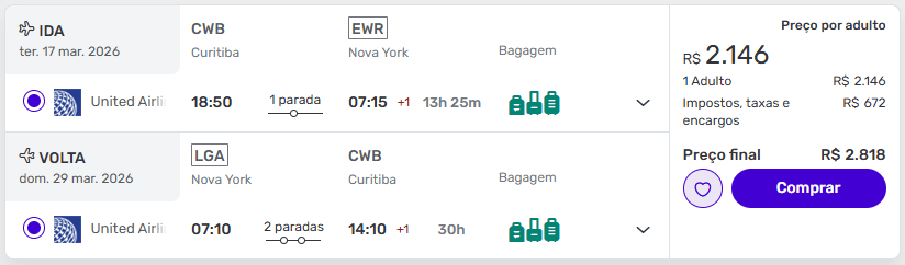 Para quem prefere viajar em março, a rota Curitiba (CWB) – Nova York (EWR/LGA) aparece como uma alternativa interessante, com bagagem despachada já incluída no valor.