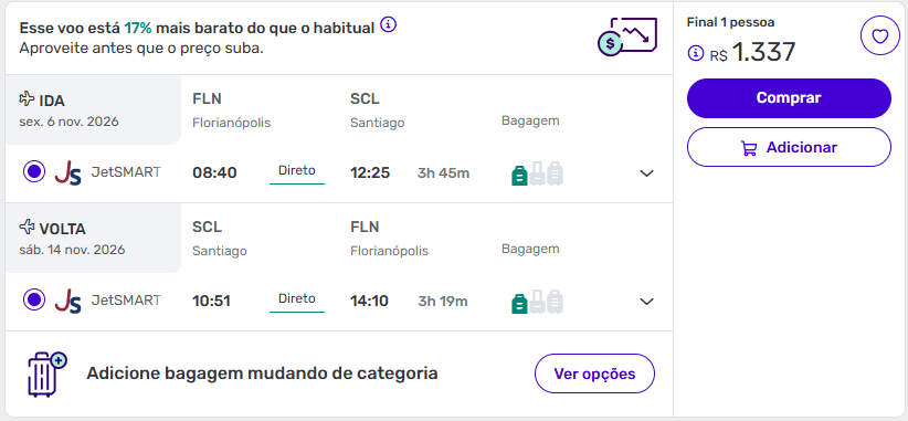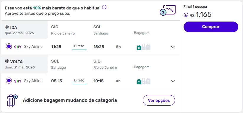 Os valores chamam atenção porque estão abaixo da média para voos entre Brasil e Chile, especialmente considerando a presença de trechos diretos e datas variadas ao longo de 2026. Em alguns casos, os descontos chegam a até 17%, o que reforça o bom momento para compra.