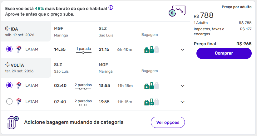 Também no Sul, há tarifas competitivas para quem parte de Maringá, especialmente no fim de setembro.