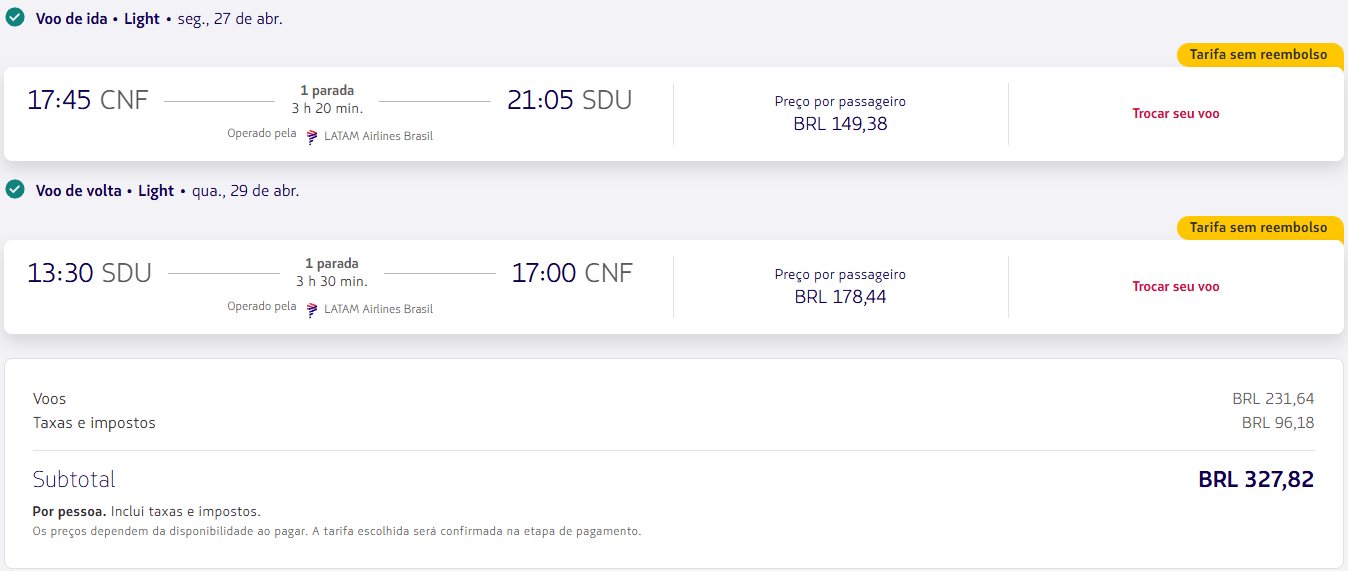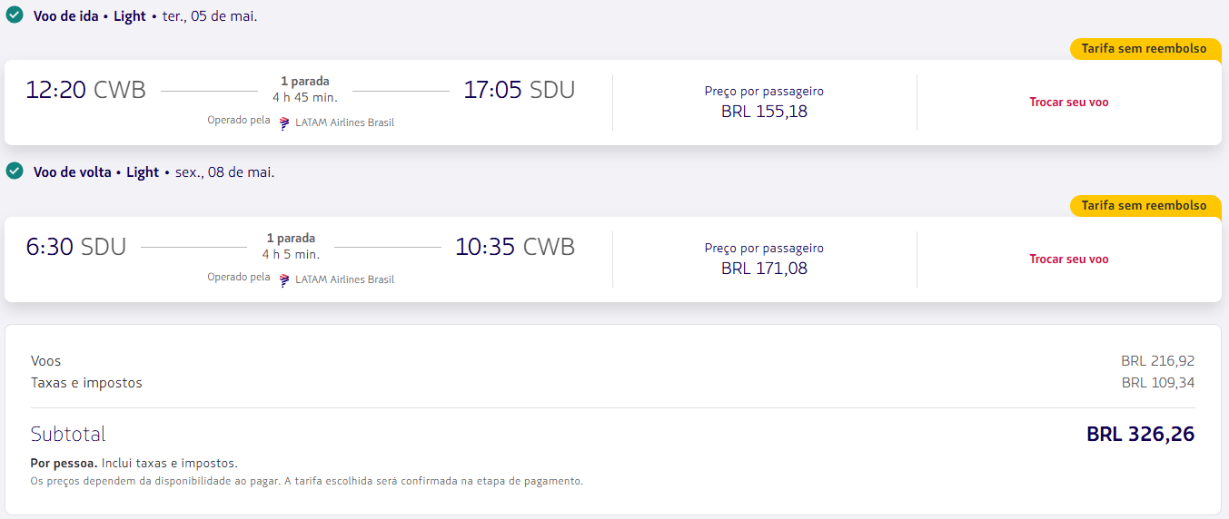Além da GOL, a LATAM também aparece com tarifas competitivas para o Rio de Janeiro em algumas datas. Em buscas saindo de Belo Horizonte e Curitiba, surgem opções de ida e volta abaixo de R$ 330, mesmo com conexão.