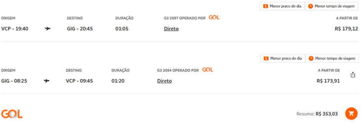 Outro exemplo aparece partindo de Campinas (Viracopos), com voos diretos para o Rio de Janeiro e preços de ida e volta a partir de R$ 353, reforçando que a queda não está restrita a um único aeroporto.
