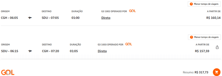Saindo da capital paulista, os preços seguem competitivos. Em simulações com voos diretos entre São Paulo (Congonhas) e o Rio de Janeiro (Santos Dumont), aparecem valores de ida e volta a partir de R$ 317, com taxas incluídas.